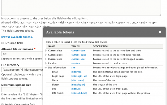 Provides additional tokens not supported by core (most notably fields), as well as a UI for browsing tokens